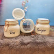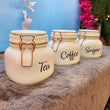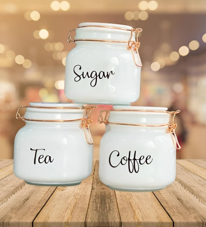 Soft white ceramic jars with handwritten-style labels (Tea, Coffee & Sugar) that blend beautifully into any kitchen style—modern, rustic or minimalistic. -