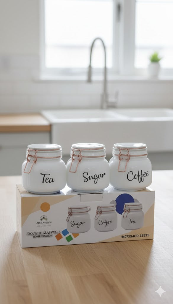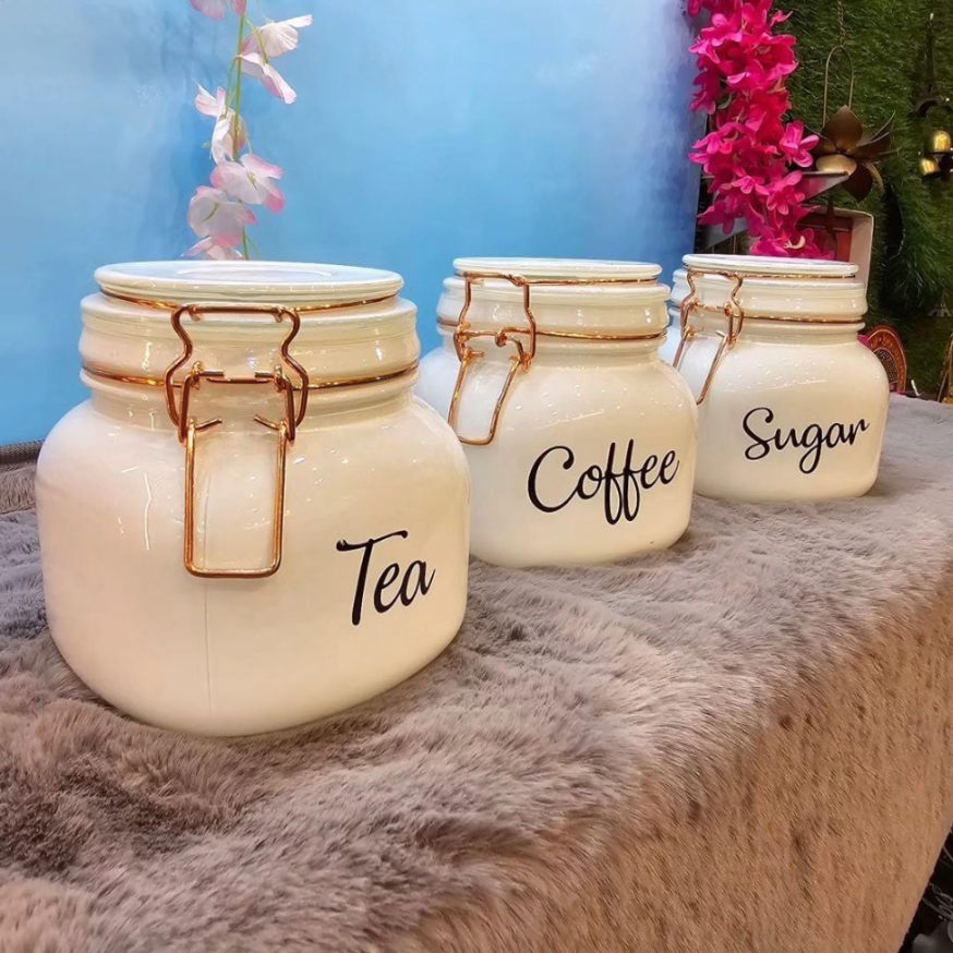 Bring charm, elegance and perfect organisation to your kitchen with this beautifully crafted Tea, Coffee & Sugar Jar Set. Made from high-quality ceramic with a glossy finish and paired with a leak-proof, airtight clamp lid, these jars keep your ingredients fresh while adding a stylish décor element to your countertop.