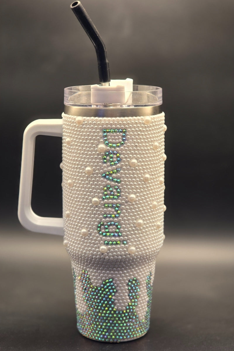 Beautifully handcrafted with sparkling rhinestones and pearl accents, this tumbler is more than drinkware – it’s a luxury statement piece. With a sturdy handle, secure lid, and reusable straw, it’s designed for both style and practicality.