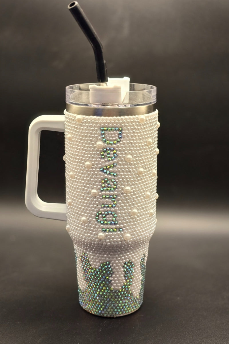 Luxury Pearl And Bling Rhinestone Personalized Tumbler With Straw