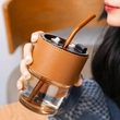 Premium Glass Coffee Mug With Leather Sleeve & Glass Straw
